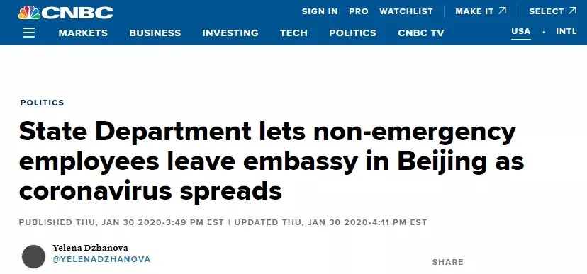 美國時(shí)間2020年1月30日,據(jù)CNBC報(bào)道,美國國務(wù)院剛剛發(fā)布最新消息,批準(zhǔn)美國駐北京大使館所有非緊急情況的政府雇員及其家屬離開,理由是目前新型冠狀病毒仍在中國繼續(xù)傳播。