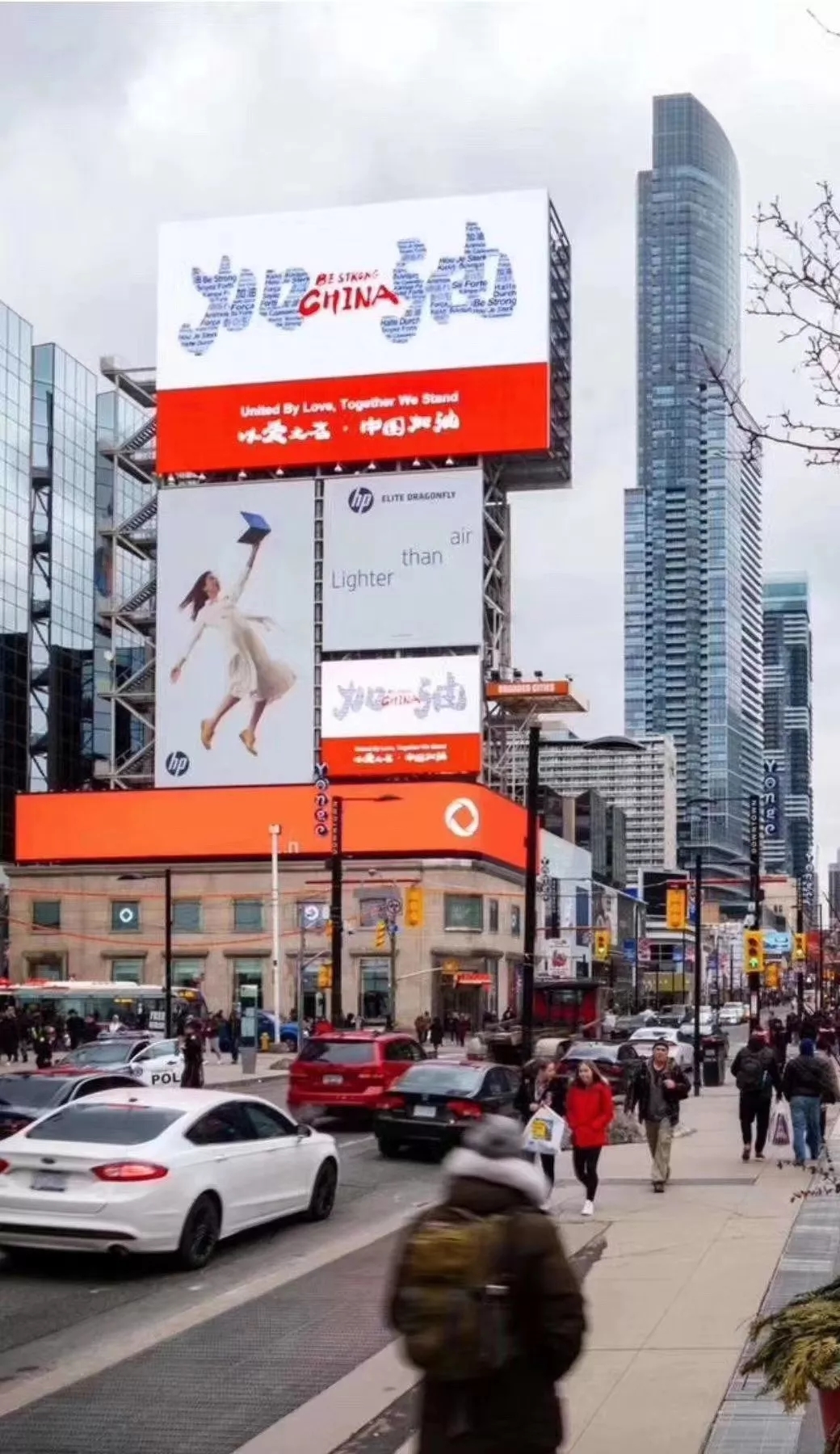 同時(shí),今天的多倫多市中心出現(xiàn)了巨幅廣告牌:加油中國(guó)!以愛之名,我們挺你!