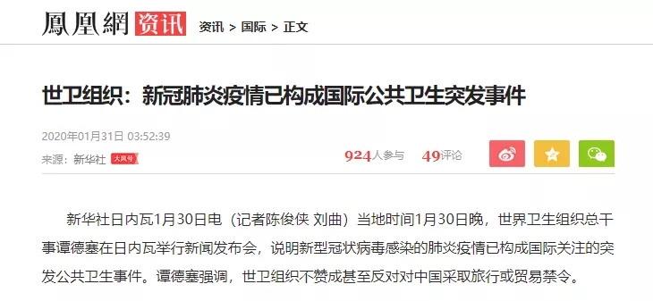 她并表示,世衛(wèi)的決定“并不出人意料”。昨天,中國(guó)的新冠肺炎疫情已構(gòu)成國(guó)際公共衛(wèi)生突發(fā)事件。