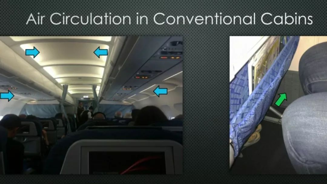 而對其他的乘客,這種危險并不顯著,因為客艙空氣在橫斷面上循環(huán),飛沫的播散被限制在少數(shù)幾排座位。