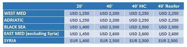 另外,從亞洲到地中海,自2020年8月1日(亞洲始發(fā)港開(kāi)始裝船的日期)開(kāi)始,直到另行通知(但不超過(guò)2020年8月14日),新的可適用的各類(lèi)運(yùn)費(fèi)如下: