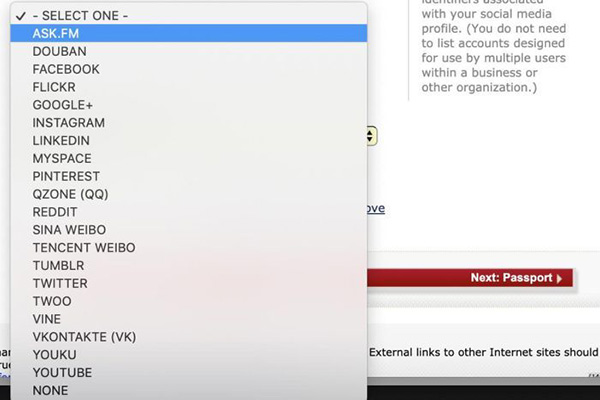 3日,澎湃新聞(www.thepaper.cn)記者登錄美國國務(wù)院“領(lǐng)事電子申請中心”網(wǎng)站后確認,目前,在線申請系統(tǒng)中已加入一個新的環(huán)節(jié),即填寫過去5年在20個社交網(wǎng)頁上使用過的個人賬號,這些社交平臺涉及到中國國內(nèi)的豆瓣、QQ空間、新浪微博、騰訊微博、優(yōu)酷等社交媒體,也包括國外流行的社交平臺如Facebook、Flickr、Google +、Instagram、LinkedIn、Reddit、Tumblr、Twitter和YouTube等網(wǎng)站。