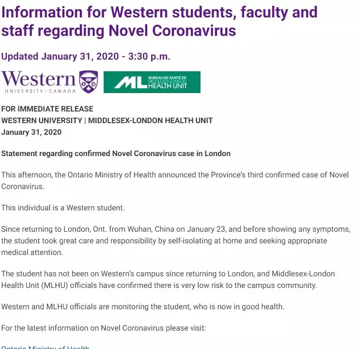 病人的具體細(xì)節(jié)為:女性,20多歲,中國(guó)留學(xué)生,就讀于安省倫敦市西安大略大學(xué)。1月22日從武漢返回安省,此日到達(dá)安省倫敦市后自行前往1月西安大略大學(xué)校醫(yī)院就診。