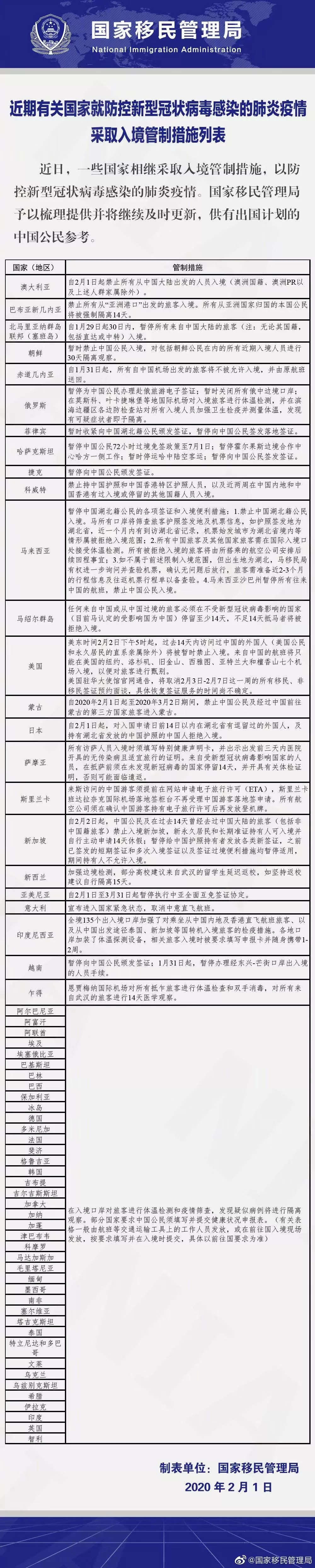 截止到北京時(shí)間2月1日,各國(guó)入境管制措施如下: