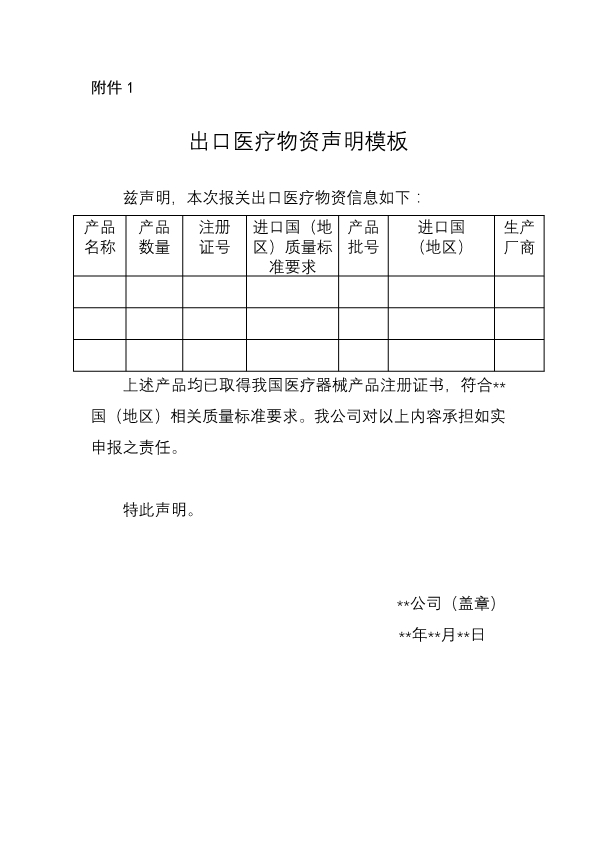 我們打開出口醫(yī)療物資聲明模板發(fā)現(xiàn),內(nèi)容包括產(chǎn)品名稱、產(chǎn)品數(shù)量、注冊證號、進口國(地區(qū))質(zhì)量標(biāo)準要求、產(chǎn)品批號、進口國(地區(qū))、生產(chǎn)廠商。