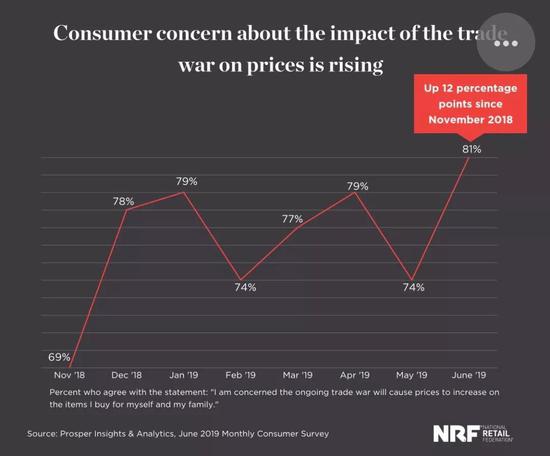 美國民眾對于加征關(guān)稅的擔(dān)憂,在美國國家零售聯(lián)合會6月份的調(diào)查中同樣有所體現(xiàn)。81%的消費者“擔(dān)心持續(xù)的貿(mào)易戰(zhàn)會導(dǎo)致價格上漲”,比2018年11月以來增長了12個百分點。