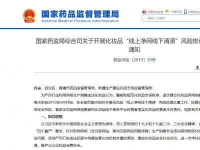 就在今年五一前夕,國(guó)家藥品監(jiān)督管理局(NMPA)正式發(fā)布《關(guān)于開展化妝品“線上凈網(wǎng)線下清源”風(fēng)險(xiǎn)排查處置工作的通知》。
