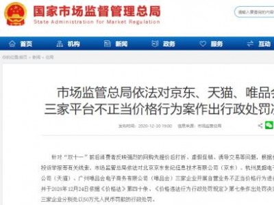市場(chǎng)監(jiān)管總局依法對(duì)京東、天貓、唯品會(huì)不正當(dāng)價(jià)格行為案