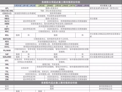 為加強新型冠狀病毒感染的肺炎疫情防控工作,有效減少人員聚集,阻斷疫情傳播,各省份先后發(fā)布了延遲企業(yè)復工通知。各大船公司也發(fā)布了延遲復工通知以及值班計劃,快來看看!