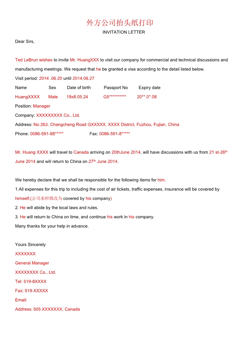 | * 商務(wù)邀請函 | 原件 | 目的國公司邀請函原件或復(fù)印件,使用抬頭紙打印,簽字并蓋章: 1、抬頭包括:公司名稱、地址、電話、傳真等信息; 2、邀請函內(nèi)容包括:被邀請人信息(姓名、護照號碼、職務(wù))、訪問目的、逗留期限、日程安排、費用支付方(旅費及醫(yī)療保險)、邀請方擔(dān)保申請人按時回國、邀請公司的聯(lián)系人、簽字人的姓名和職務(wù); 3、如參加展會,需提供英文展位圖和付費發(fā)票; | 查看樣例 |